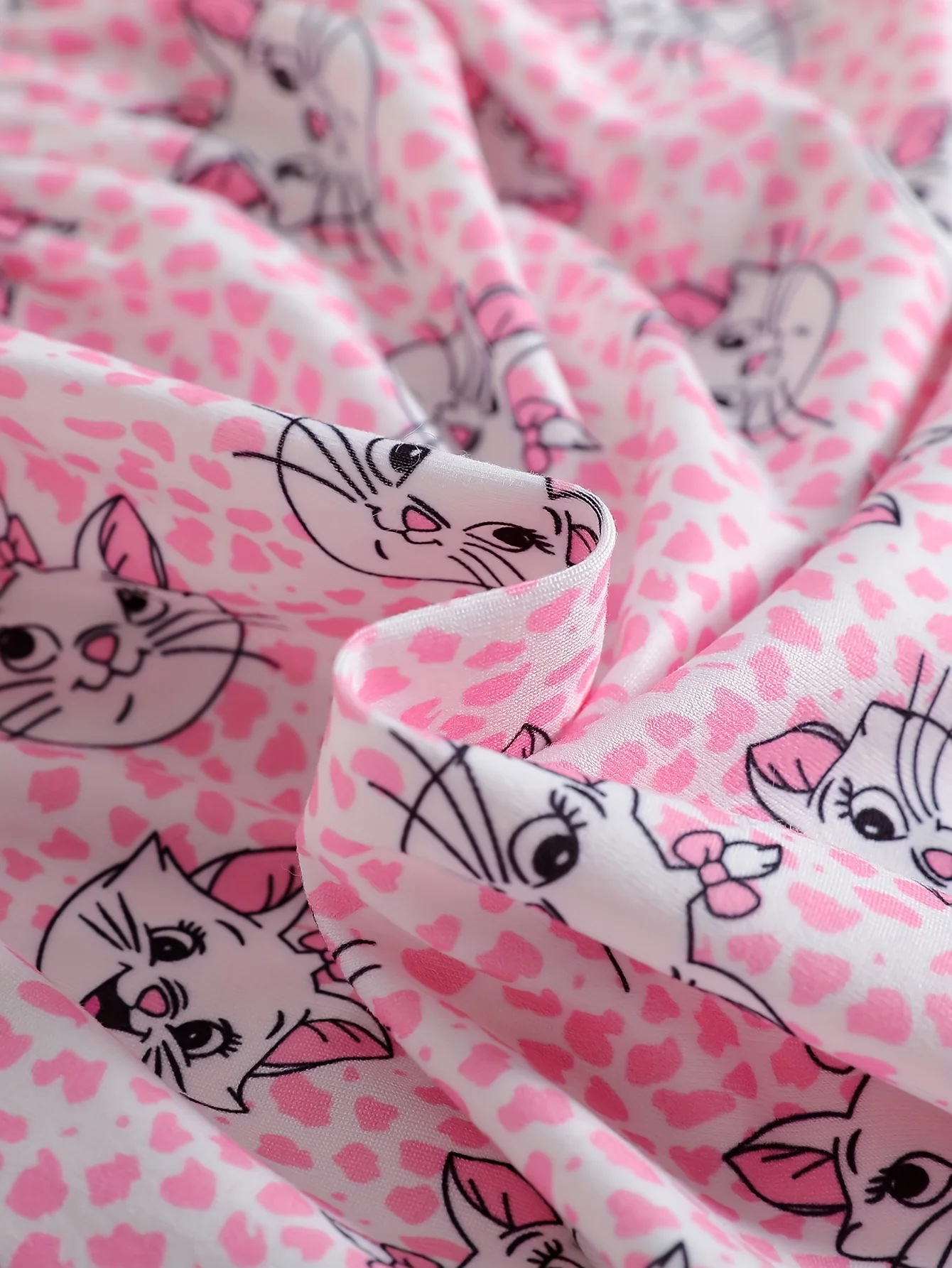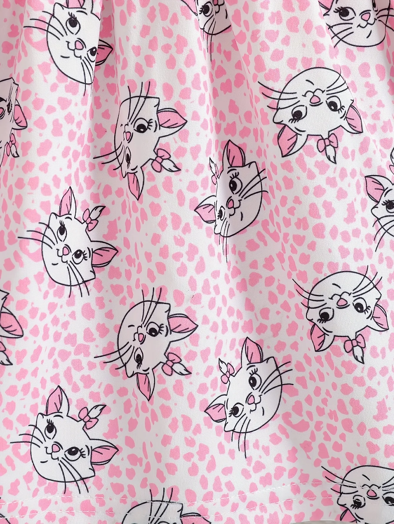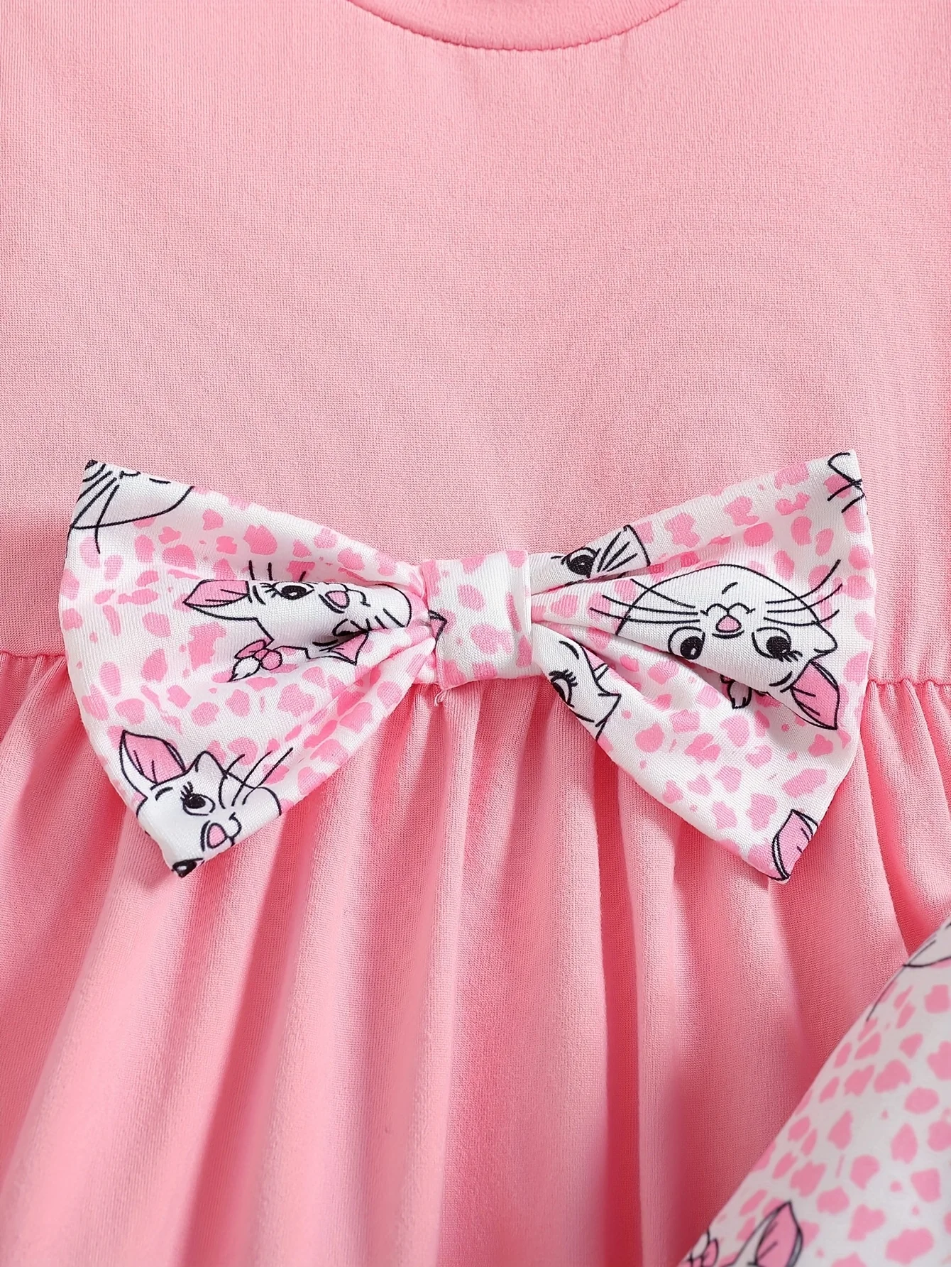 The base is fully printed with "cats + small dots" pattern, and the waist is adorned with a matching pure pink large bow, presenting a more