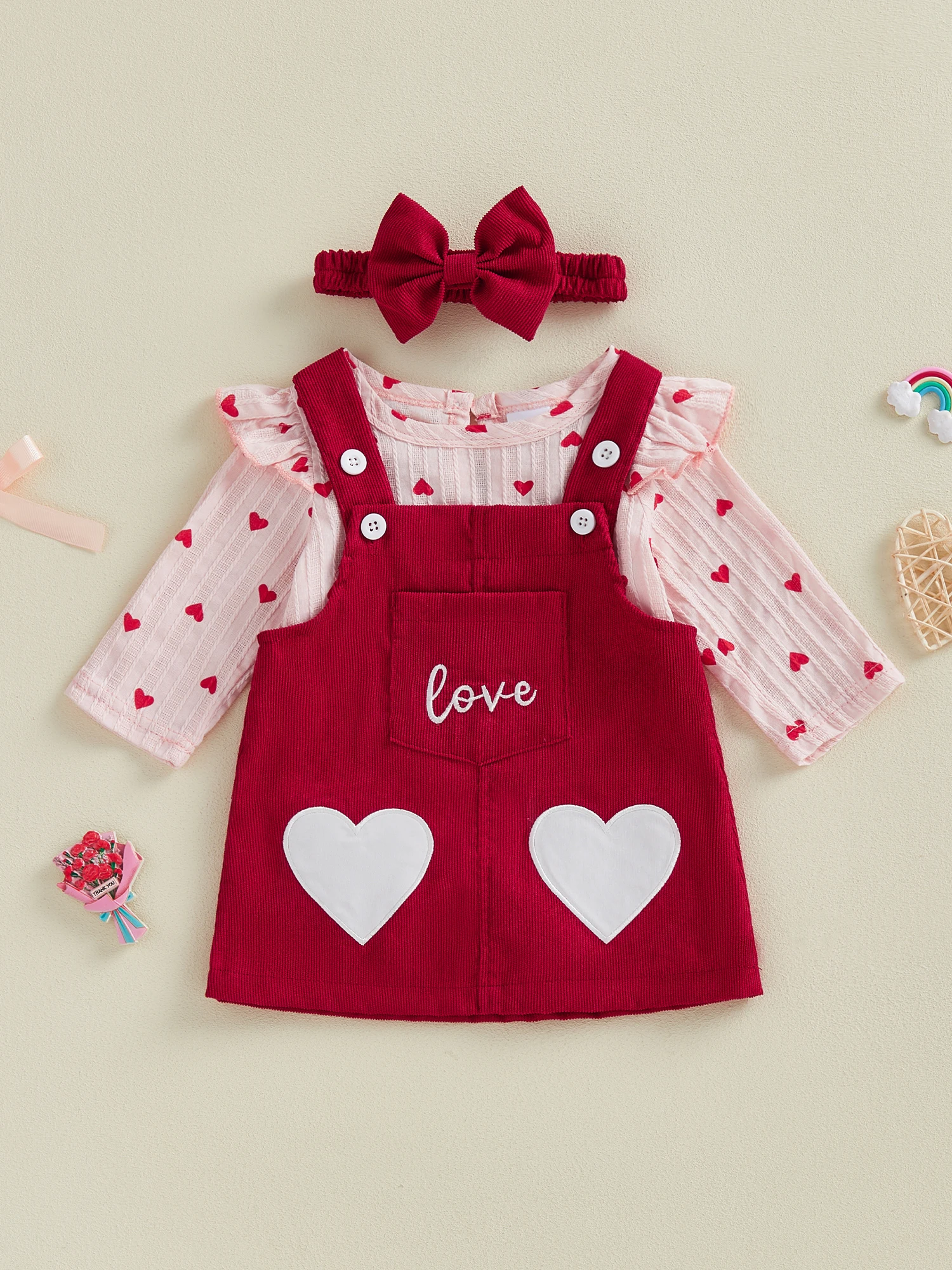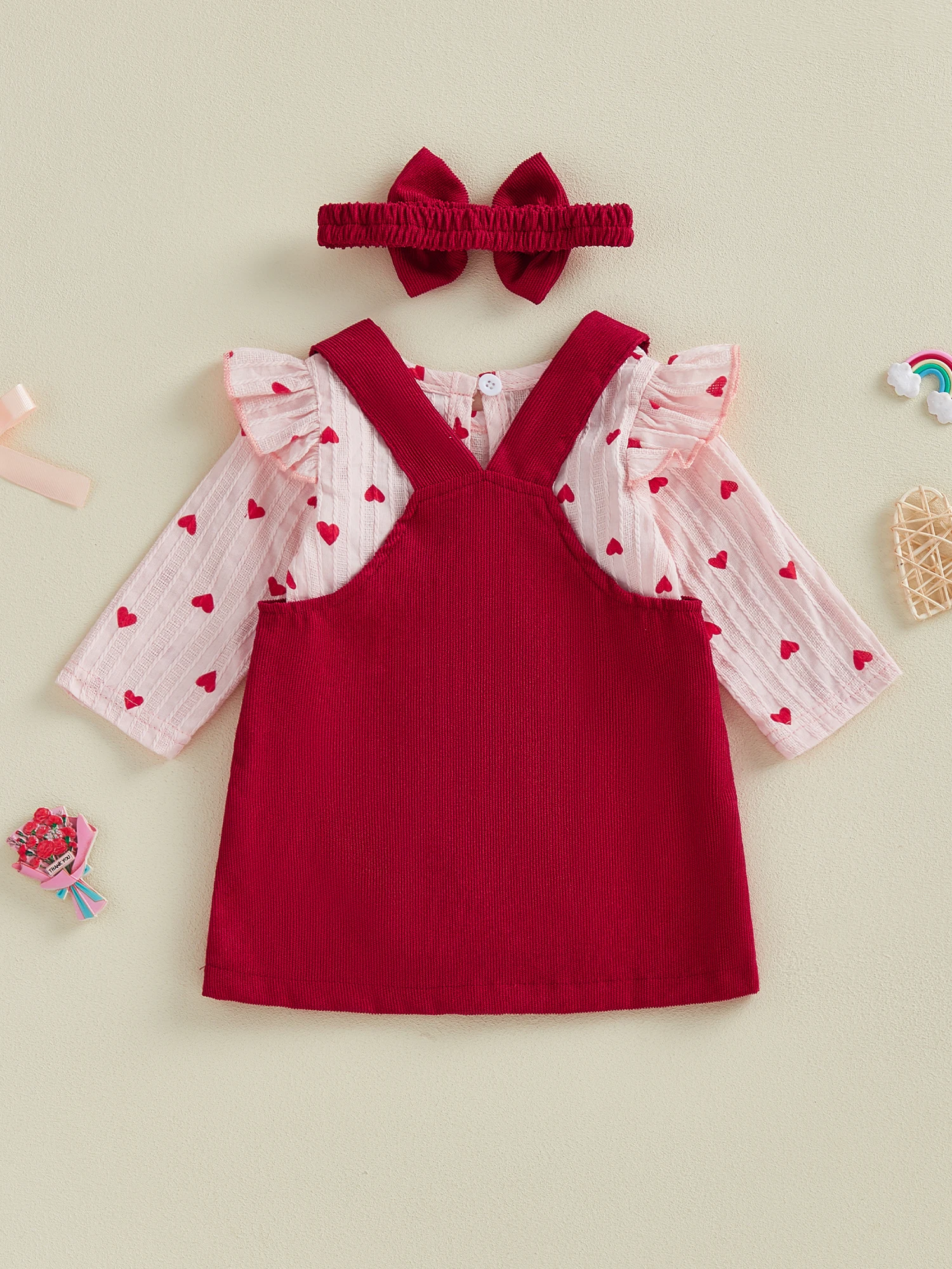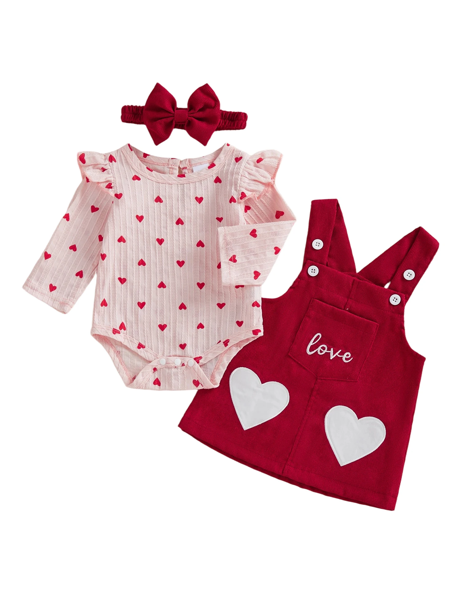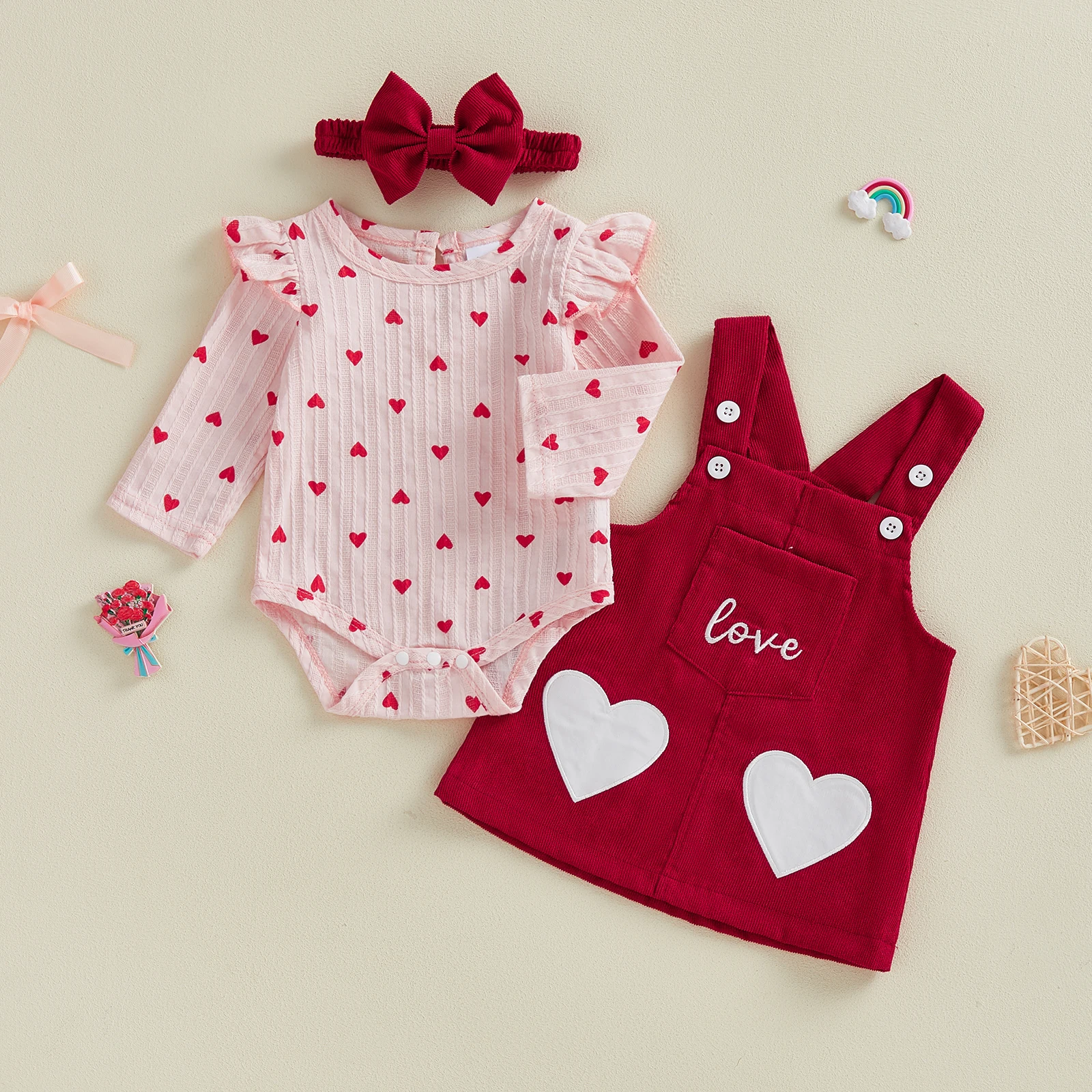 Valentine’s Day Baby Girls 3 Piece Outfit Cute Long Sleeve O Neck Heart Print Jumpsuit Bow Headband Overall Dress Set