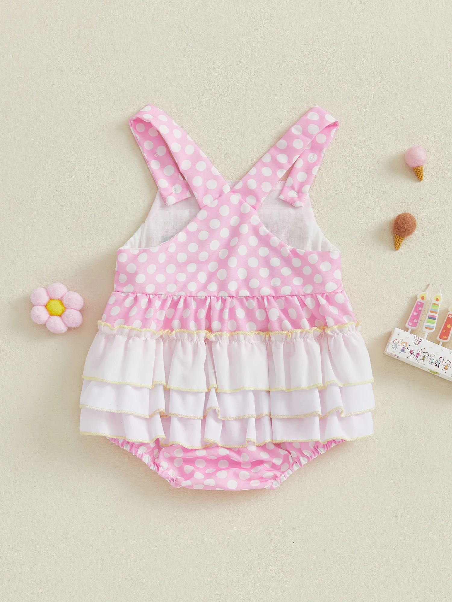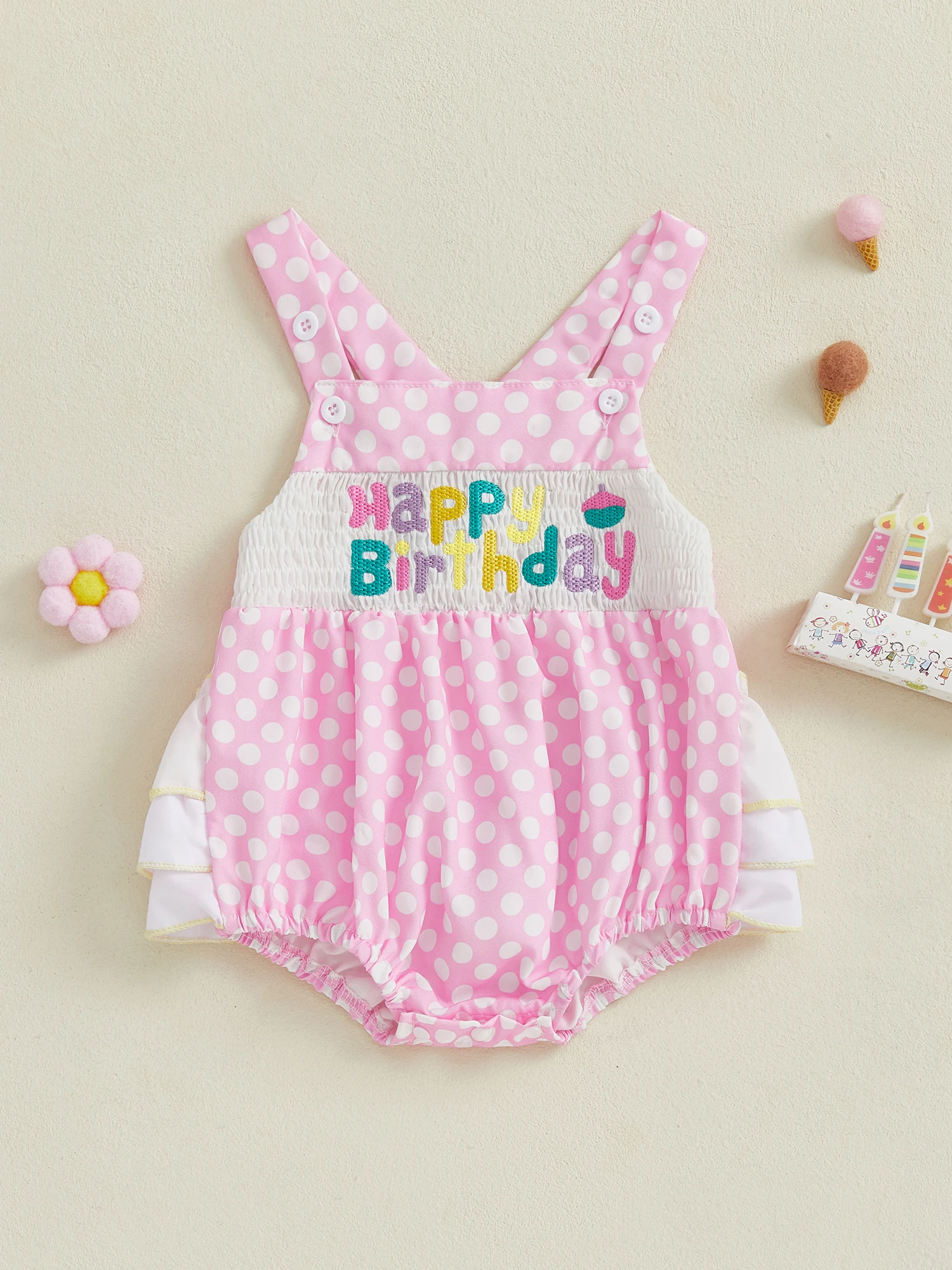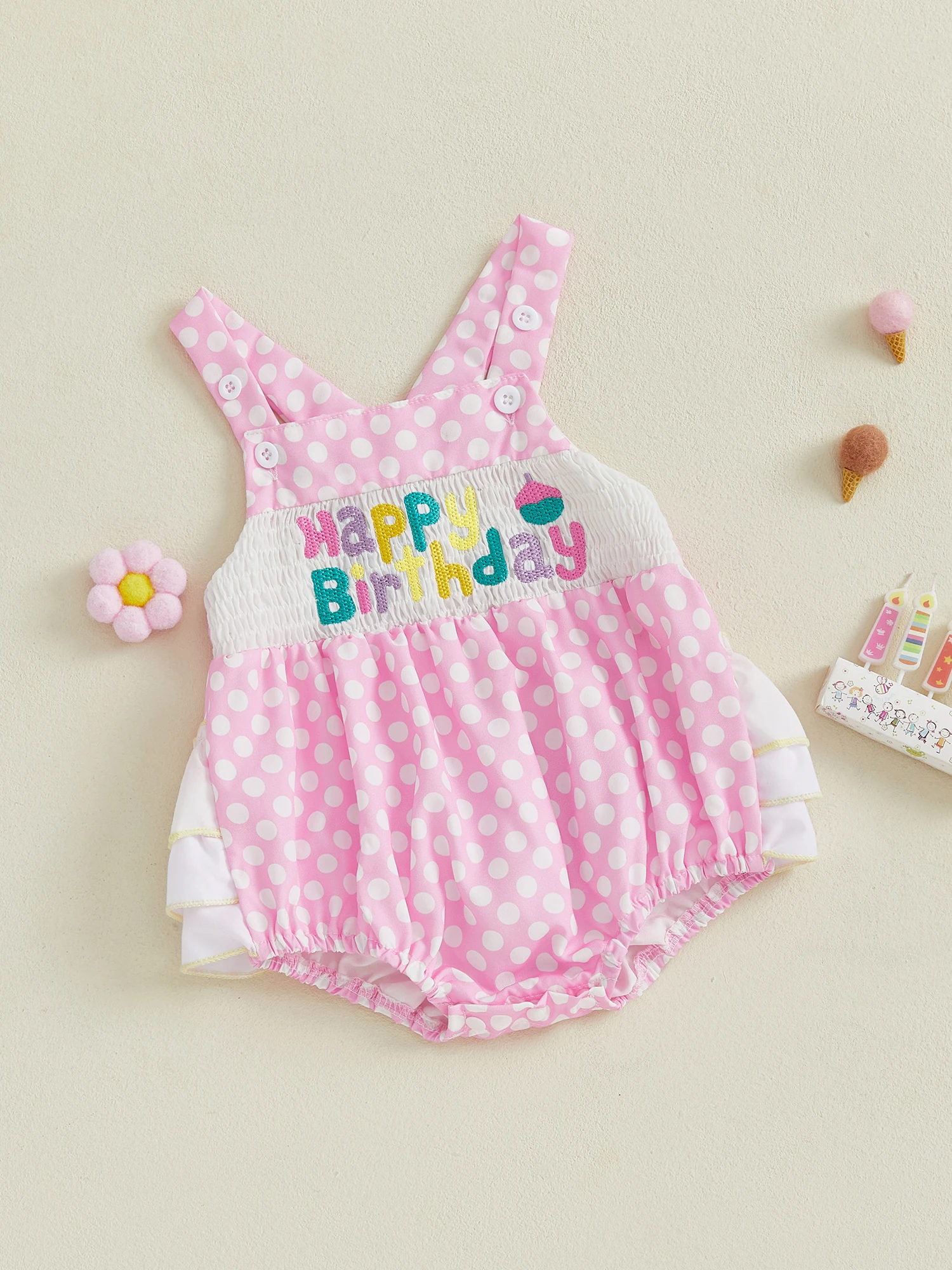 Baby Girl Birthday Day Romper Sleeveless Letter Embroidery Dot Print Cami Jumpsuit