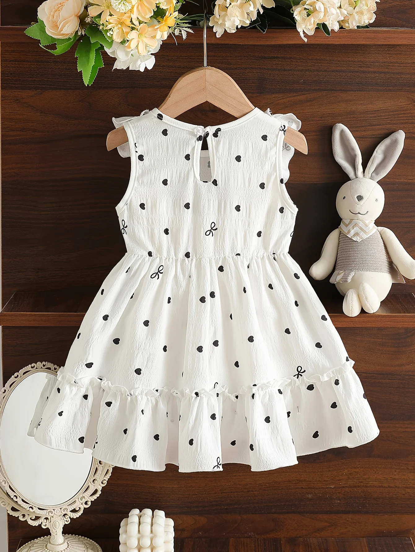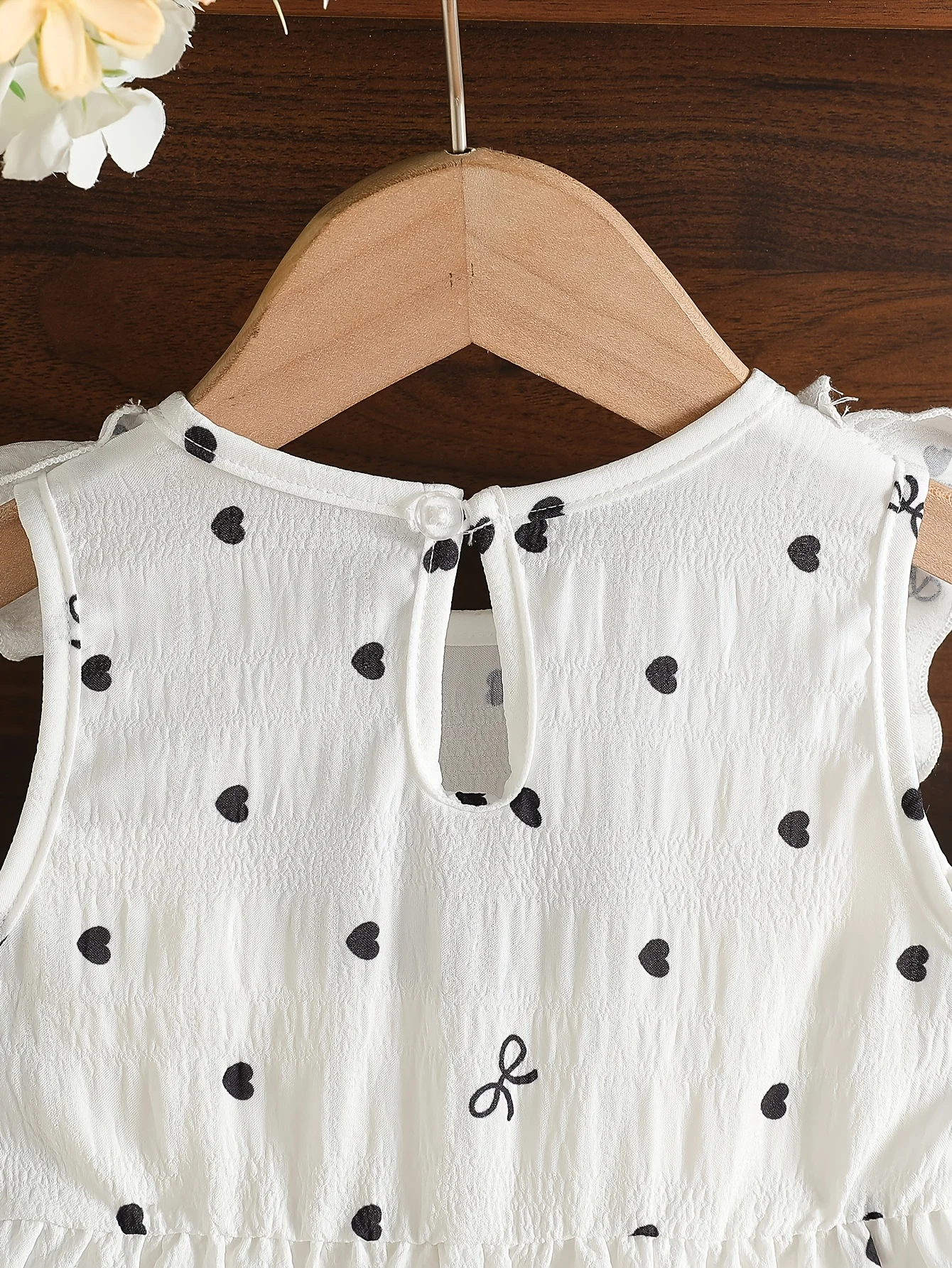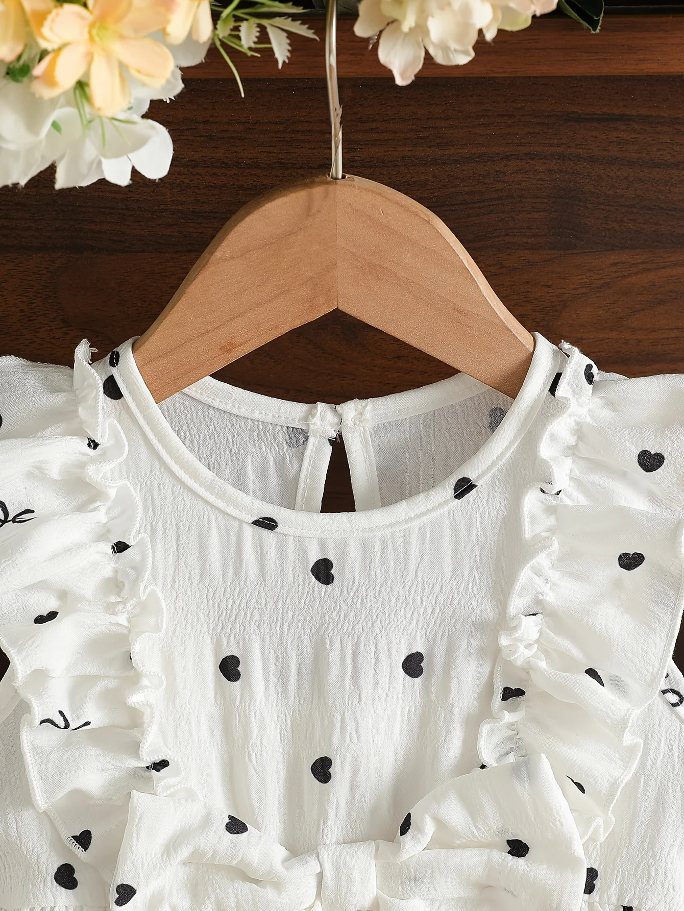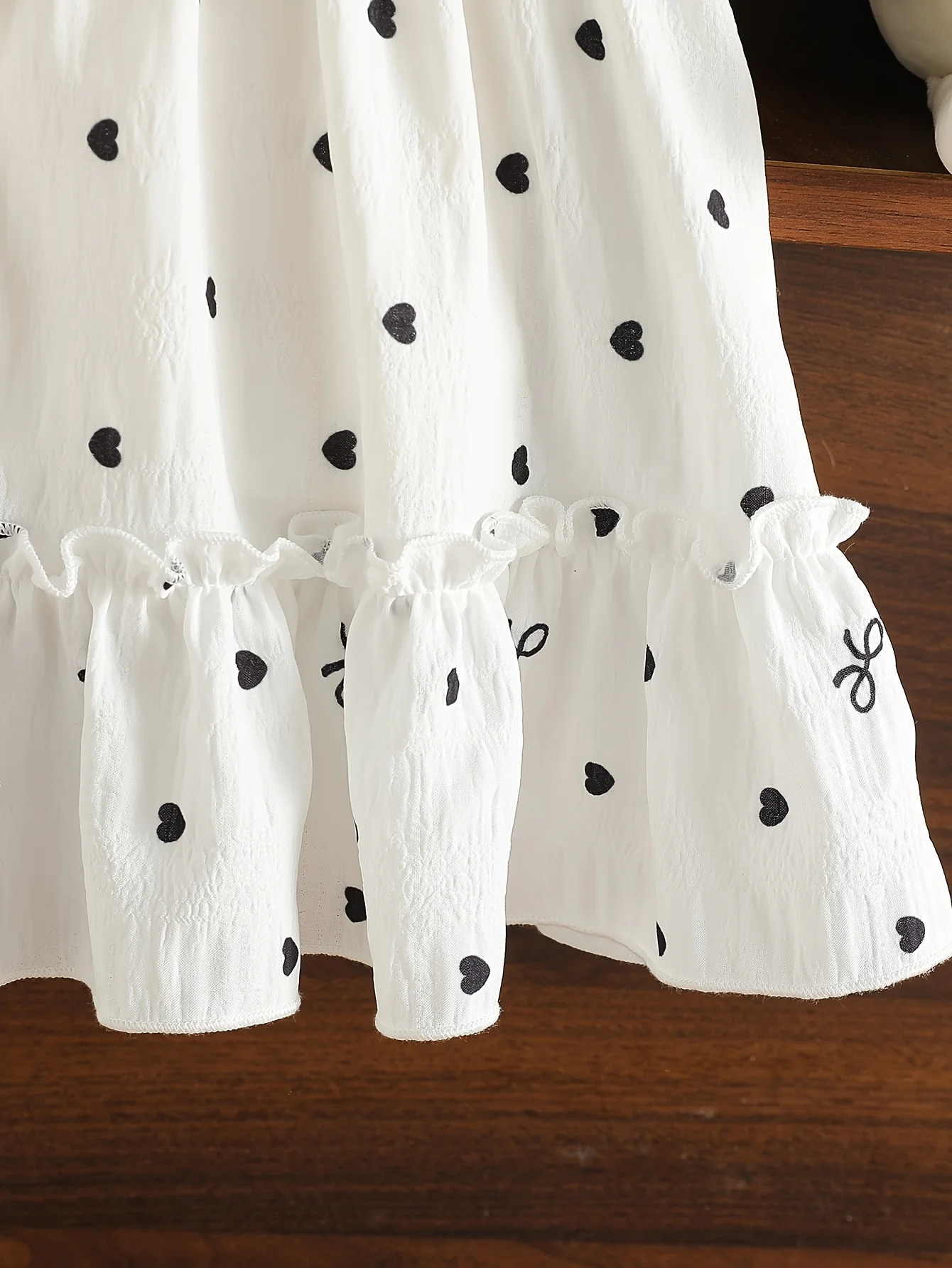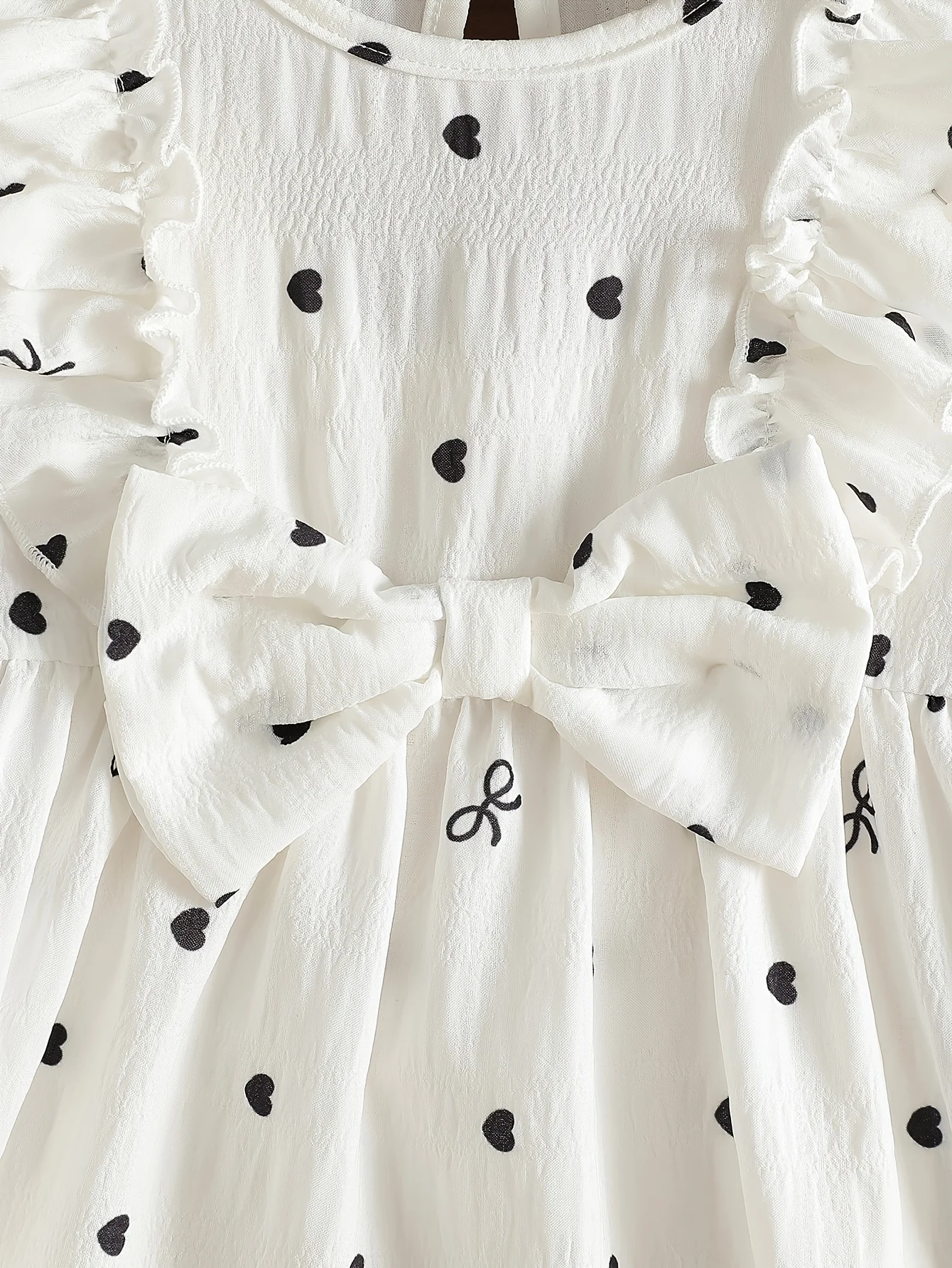 Heart-shaped polka dot print: The entire body is covered with cute black heart-shaped polka dot patterns, with sizes arranged in a disorderly manner, visually lively and playful, full of childlike charm.